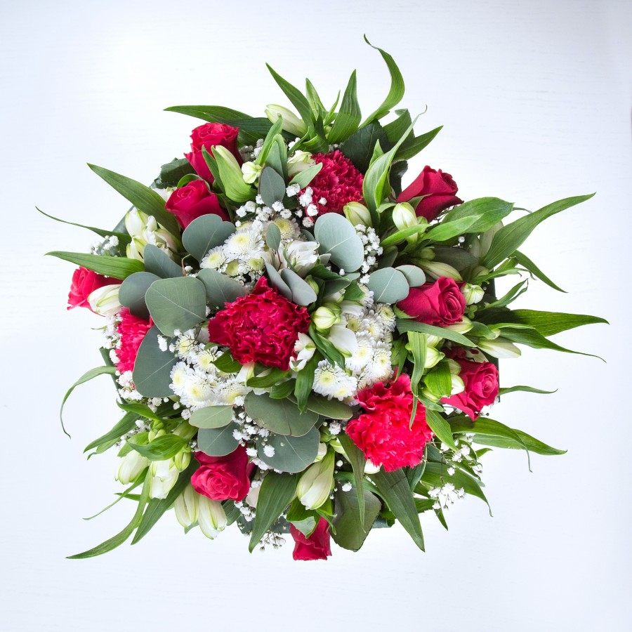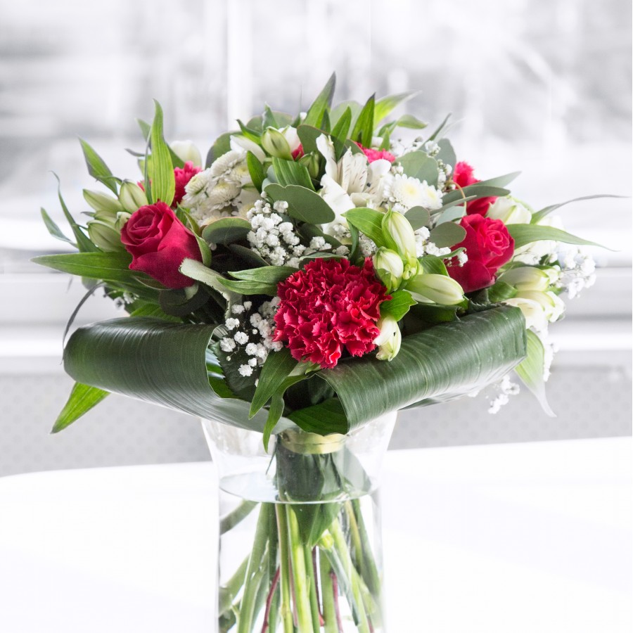 Delight in the elegance and uniqueness of our luxurious bouquet, designed to ignite your creativity. This exquisite arrangement combines sweet white chrysanthemums, delicate gypsophila, opulent red roses, vivid carnations, pure white alstroemeria, and stylish aspidistra leaves, meticulously arranged for a stunning visual impact.